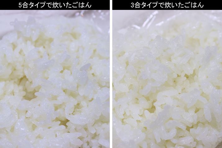 ほぼ時間差なく、3合タイプも炊きあがりました。普通の炊飯器では、小容量タイプは圧倒的に香りが弱いことが多かったので期待せずにフタを開けたところ、5合タイプと同レベルの香りが! ウソでしょ!? と思わずつぶやいてしまいました。炊きあがりの印象は、3合タイプ、5合タイプともに互角です