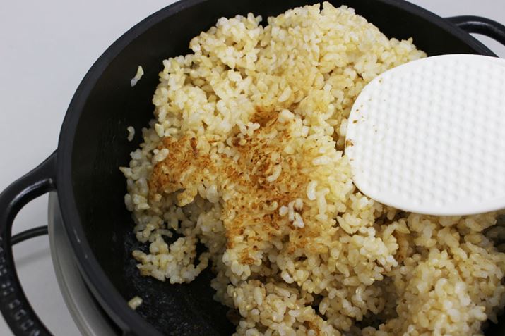 家電ライターが試した5合タイプの「バーミキュラ ライスポット」のレビューで、白米にこんがり付いたおこげを見てから、バーミキュラ ライスポット ミニでも同じことをしてみたいと思っていました。白米でできるのは間違いないので、今回は、炊き込みごはんと玄米のおこげにトライ!