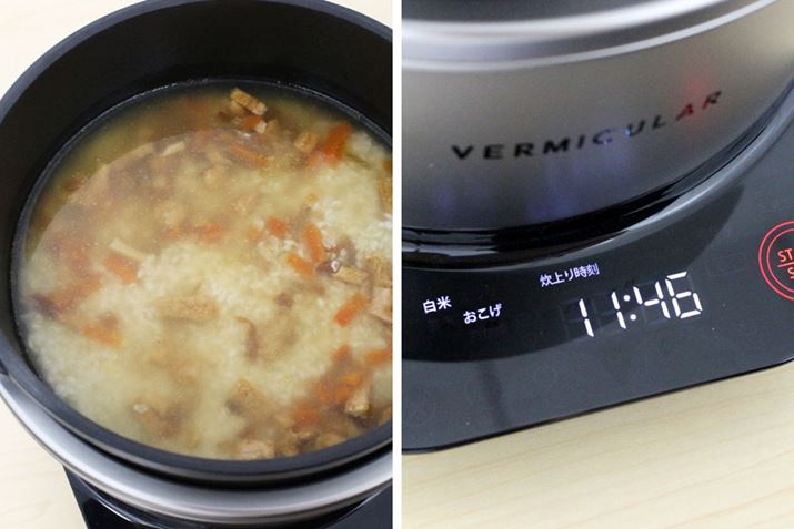 炊飯量を設定するなど、少々普通の炊飯器とは違う点はありますが、運転をスタートしてからはバーミキュラ ライスポットにおまかせでOK。浸水工程も行ってくれ、白米(標準)は約1時間で炊きあがります(浸水30分+炊飯30分)