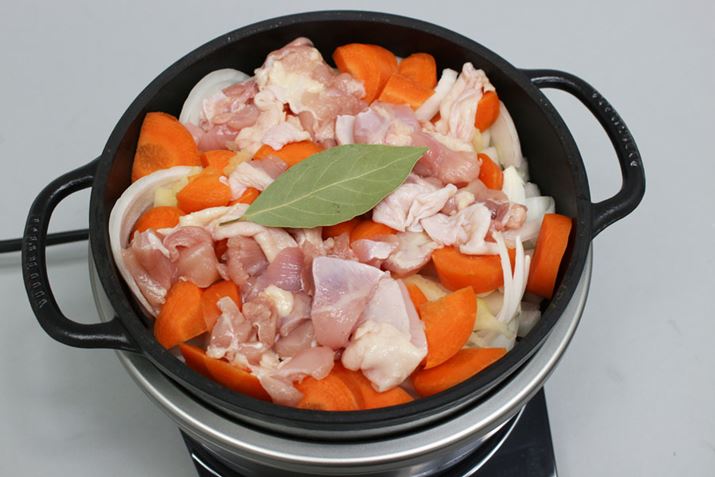 バーミキュラ ライスポットの特性を生かし、無水カレーを作ります。カットしたトマト、玉ねぎ、セロリ、にんじん、鶏肉をポットに入れたら準備完了。水は入れません
