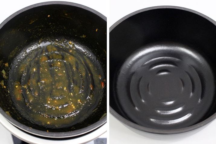 カレーを作ったあとのポットを見てみると、カレーは付着していますが、焦げ付きはなし。洗剤で洗えば、油までキレイに落とせました。この段階でニオイもしません