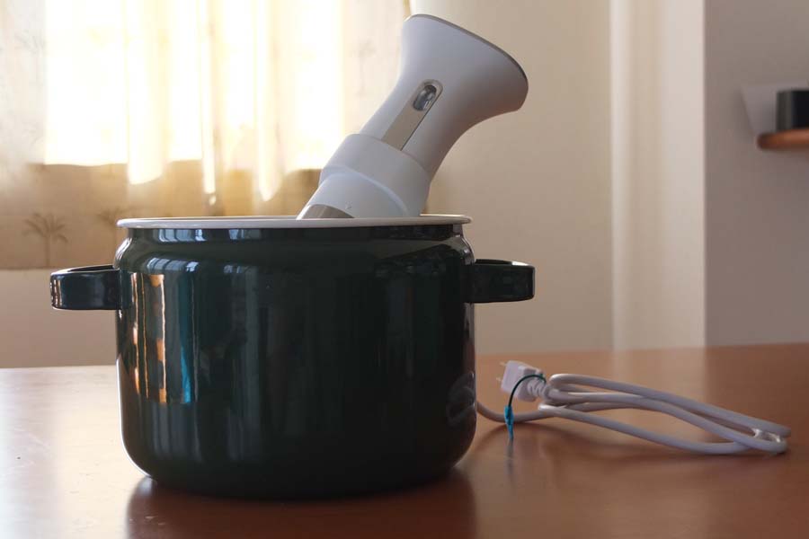 収納に関しては、ちょっと微妙。サイズ的にはハンディのブレンダー程度の大きさで、低温調理できる電気鍋などに比べると圧倒的に省スペースなのですが、本体が約1.2kgとそこそこ重く、重心も上にあるので、立てかけ収納がしにくいです。かなりずっしり重いか、収納棚に固定できるキッチンツールスタンドがあれば、すっきり収納できそうです。