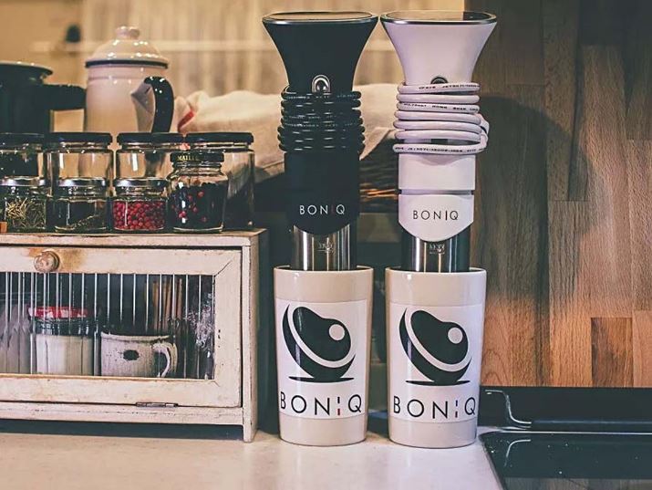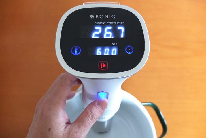 BONIQは、温度計や水位計などのセンサーと加熱コイル(ヒーター)、サーキュレーターを内蔵した調理器具。使い方は簡単で、深鍋に本体を設置したら、調理する温度と加熱時間を設定し、「ジップロック」などの密封できる袋に入れた食材を浸けておくだけ。ヒーターが設定温度まで中の湯を加熱し、あとは温度計でお湯の温度を検知しながらヒーターのON/OFFを繰り返して、温度を一定に保ちます。また、サーキュレーターでお湯を対流させることで、鍋のお湯の温度を均一にキープ。電源さえあればどこでも使えるのが魅力で、また火を使わないので安全です。