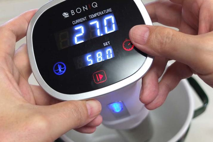 温度は5℃から100℃、加熱時間は1分から99時間59分まで設定できます。設定を終えてスタート/ストップボタンを押すとヒーターが加熱を始め、お湯が設定温度に達したらアラームが鳴ります。また、設定時間に達すると再びアラームが鳴るので、再びスタート/ストップボタンを押して調理を終了します。ちなみに、食品衛生上の理由で、設定時間が過ぎてもスタート/ストップボタンを押すまで加熱し続けるように設定されています。