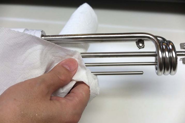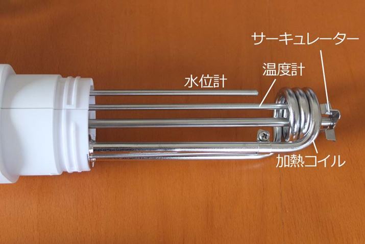 ステンレスカバーを外した状態。1番上にあるのが水位計。その下が温度計。真ん中にサーキュレーター用のバーがあり、1番下が加熱コイルにつながっています。加熱コイルの下に空焚き防止センサーも隠れています