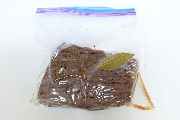 塩・こしょうした牛もも肉の表面を強火で焼き固め、ジップ袋に焼いた牛もも肉とローリエを入れて空気を抜いておきます