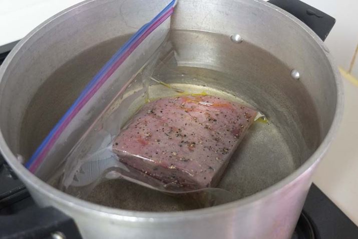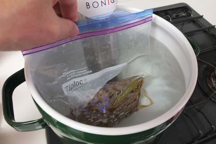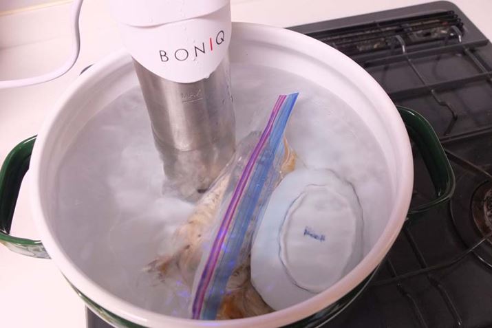 BONIQをセットした鍋に、肉の入ったジップ袋を入れて湯せんします。ちなみに、食材の入ったジップ袋を真空にするには、袋ごと少しずつお湯につけていくのがコツ。袋の中に水圧がかかって空気が抜けていきます。内部を真空にすることで効率よく火が通るだけでなく、味も肉に染みやすくなり、なおかつ雑菌の繁殖を抑えることができるそう。