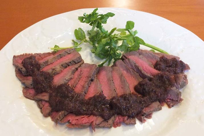 赤ワインとすりおろし玉ねぎ、砂糖、しょうゆで作った玉ねぎ赤ワインソースでいただきました。付け合わせはクレソン