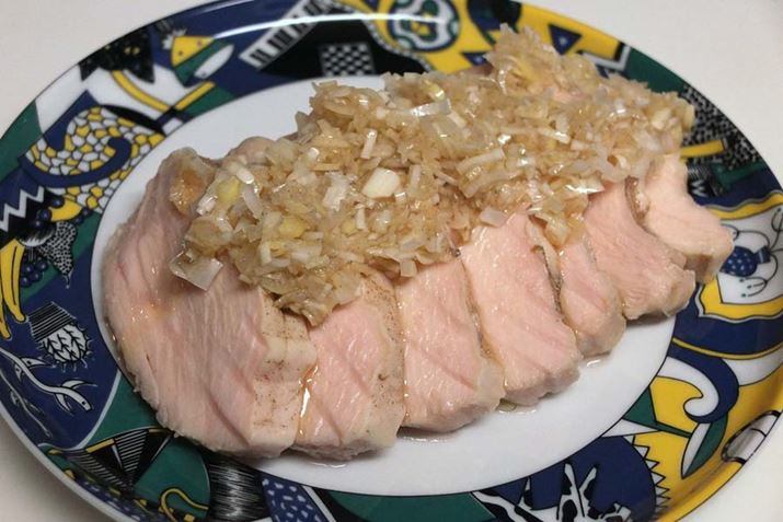 ねぎとしょうが、ごま油のタレをたっぷりかけていただきました。鶏むね肉はよく食べますが、これほどしっとりした味わいは生まれて初めて。これがわが家でできたとは信じられないほどです