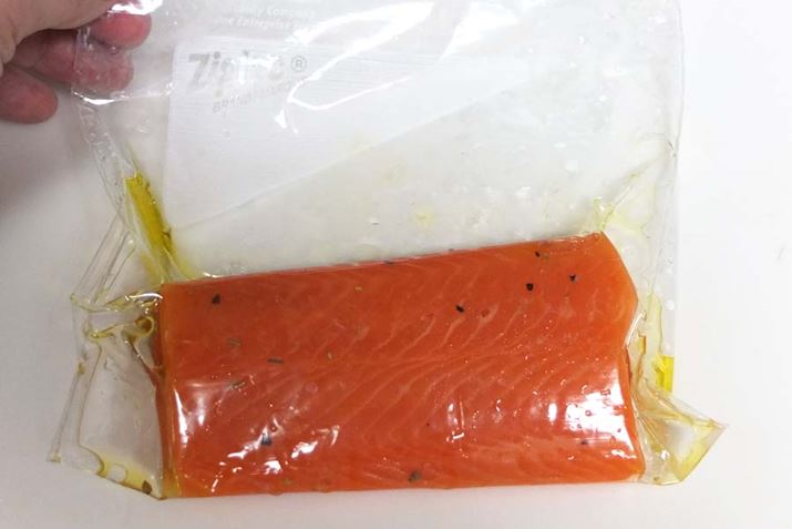 サーモンのさくに塩・こしょうし、ジップ袋に入れてエクストラバージンオリーブオイルを少し垂らして密封し湯せん
