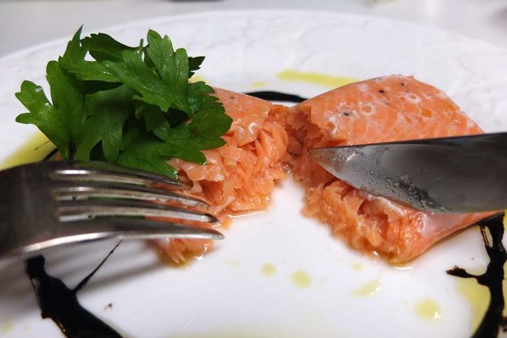 バルサミコソースとエクストラバージンオリーブオイルを散らし、イタリアンパセリを添えました。サーモンは表面がやや白く凝固していますが、見た目は“生”感がしっかり残っています。ナイフで中を切ってみると、ホロッとほどけましたが、味は生のサーモンのうまみが熱で活性化されたような濃厚さがありました