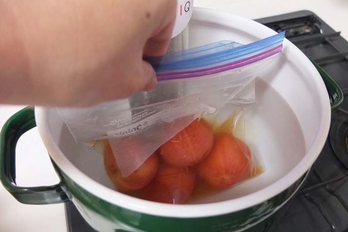 トマトを湯むきし、だしと薄口しょうゆ、煮切ったみりんが入った調味液とともにジップ袋に入れて湯せんします
