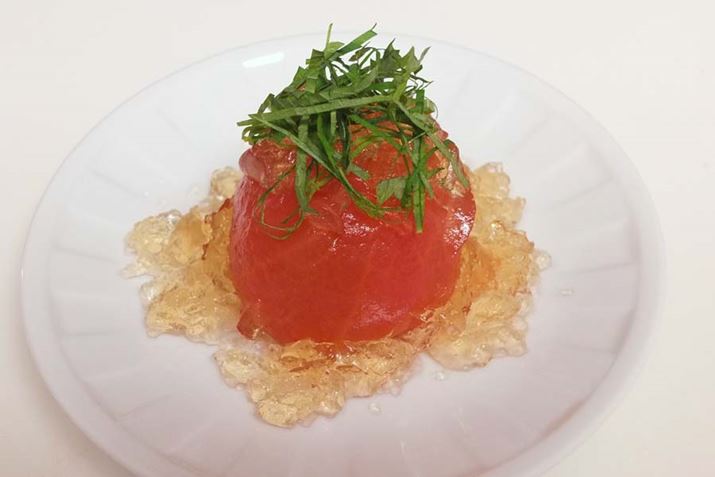 野菜料理では、「まるごとトマトのジュレがけ」に挑戦。と言っても難しいことはなく、湯むきしたトマトを調味液に浸けて60℃で20分湯せんし、その煮汁でジュレを作るだけです。トマトのうまみ成分であるグルタミン酸、アスパラギン酸と、調味液に入れるかつおだしに含まれるイノシン酸が組み合わさって味の深みが増し、皮を湯むきしているため食感もなめらか。湯せんしたトマトを氷水で冷やしたり、それなりに手間はかかるので、いつも作れる料理ではありませんが、おもてなし料理にぴったりの一品です。