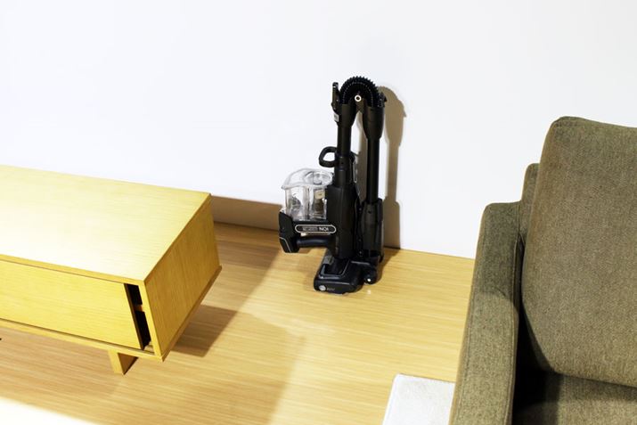 さらに深く曲げて折りたためば、収納スタイルに。収納時のサイズは239(幅)×605(高さ)×295(奥行)mm。コンパクトなうえに、自立するのは魅力的です。この状態から掃除を始めるのも、収納するのも手間はありません(下の動画参照)