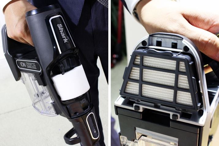 ダストボックスでゴミと空気が遠心分離され、空気のみ排気されますが、排気口には0.3μmの 粒子を99.97%以上キャッチできるHEPAフィルター(右)を装備し、クリーンな排気をサポート。さらに、モーター部にホコリが入らないようにするためのフィルターも備えられています(右)。どちらも、水洗い可能