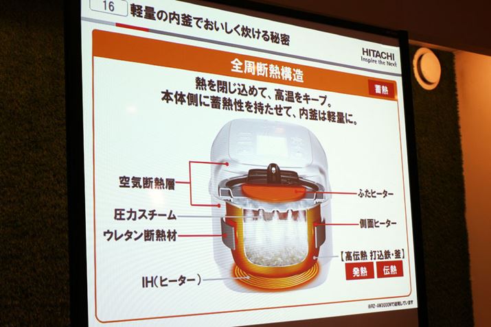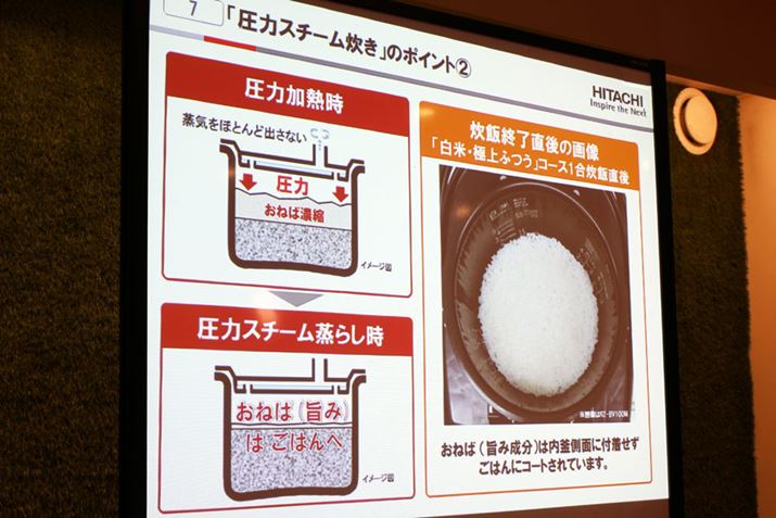 「ふっくら御膳」シリーズの特徴は、炊飯工程で1.2気圧の圧力をかけることで沸点を105℃まで上昇させ、蒸らし工程で最高105℃のスチームを投入するというように、圧力をかけながらスチームで蒸らす炊飯方式を採用していること。他メーカーの炊飯器にも圧力とスチームの両方を使用して炊飯するモデルはありますが、一般的にスチーム投入時には減圧するため、内釜内の温度は低下します。いっぽう日立は、圧力をかけたままスチームを投入できるので、お米がおいしく炊けるという98℃以上の高温をキープできるのがポイント。また、減圧せずに最後まで炊飯することで「おねば」が蒸気とともに外に逃げるのを防げるため、ごはんの旨みもたっぷり! この炊飯方法は、新たにラインアップに加わったエントリーモデル「RZ-BV100M」にも採用されています。