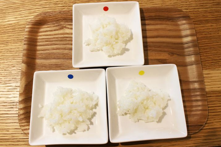 「少量2合」で食感を炊き分けたごはんを食べ比べてみました。赤色のシールが付いた皿が「極上もちもち」、青色のシールが「極上しゃっきり」、黄色のシールが「極上ふつう」ですが、見た目では違いはわかりません