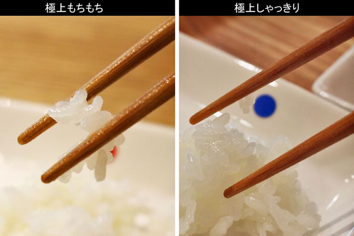 食べてみると、食感の差は明らか! 写真でもわかるように「極上もちもち」で炊いたごはんは、お箸にたくさんくっつくほど粘土があります。「極上しゃっきり」は粒感が増した感じですが、その中にももっちり感あり。少量のお米で、これだけきちんと炊き分けできるのは見事です