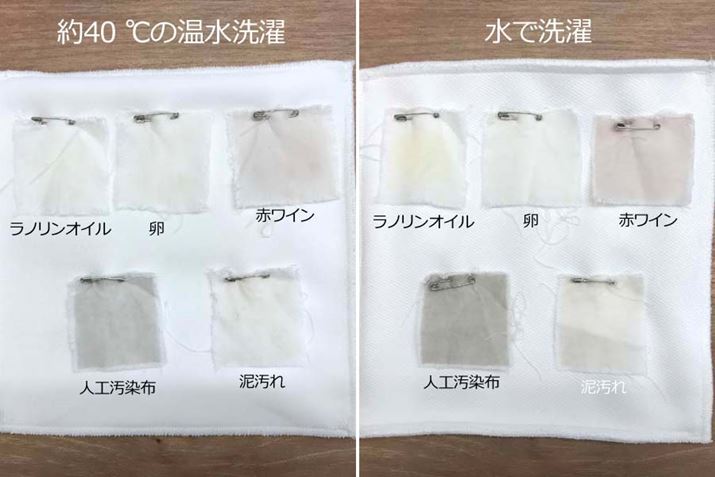 洗い上がりを見てみると、常温の水で洗ったものに比べ、やはり「約40 ℃おまかせコース」で洗ったほうが、全体的に汚れが落ちの効果が高くなっているのがわかります。
