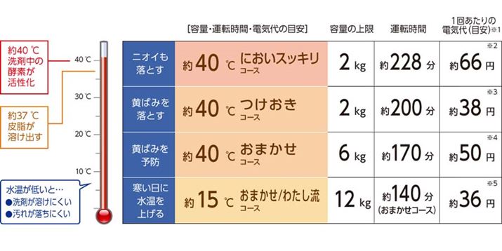 常温での洗濯に比べ、「温水泡洗浄W」の洗浄力が高いことがわかりましたが、汚れが落ちやすい半面、水を温めるための時間が必要になります。そのため、どうしても洗濯の時間が長くなり、どのコースも3時間前後かかってしまうのがネック。日常的に毎回の洗濯で使う場合には、運転時間を考慮して、たとえば夜寝ている間に行うなど工夫が必要だと思います。また、洗濯できる量も減ってしまうので注意が必要です。