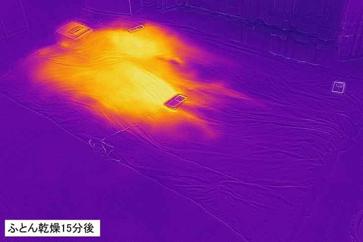 この状態でかけ布団をかけ、布団乾燥運転を行います。なお、運転開始前の温度は、中心部が27.1℃、足元が27.4℃、枕側が27.2℃