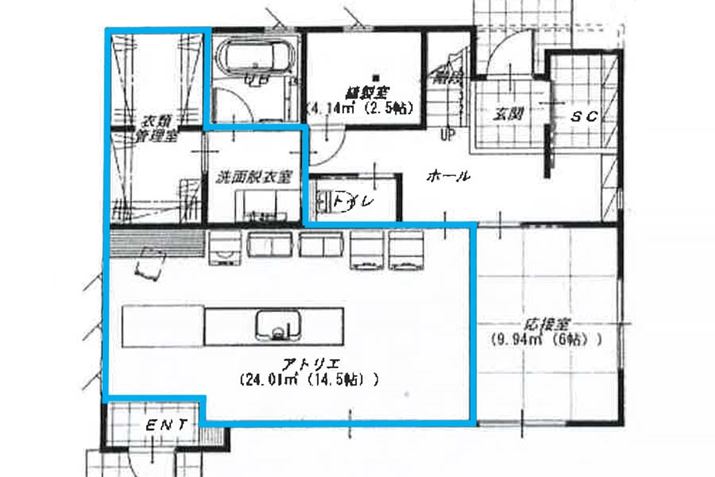 センタクアトリエ1階の図面。1階の半分以上、青枠で囲んだ部分がすべて洗濯に関わるスペースになっているだけでなく、1階の3分の1のスペースが洗濯だけを行うアトリエになっています
