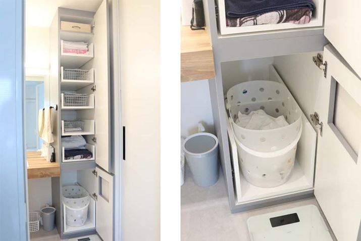 洗面脱衣室には、家族それぞれに振り分けられる6段の引き出しと洗濯かご置き場を設置。まず洗濯かごに、脱いだ衣類や使用済のタオルなどを入れます