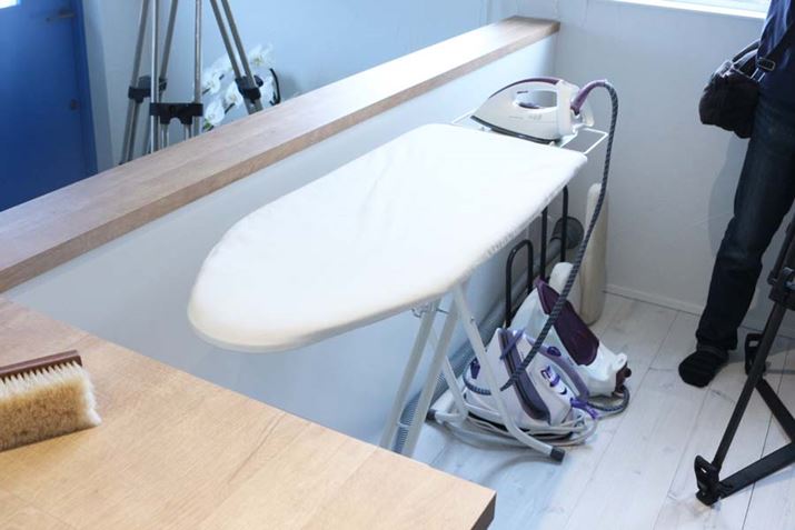 物干し竿のそばにはアイロンとアイロン台もスタンバイ。しわ伸ばしが必要な衣類は、乾いたあとすぐにアイロンをかけられます