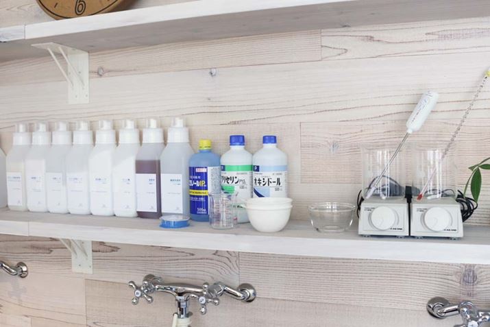洗剤だけでなく、界面活性剤、アルカリ剤などの原料を用意。「料理で言うと、みそ・塩・醤油という感じ」だそう。衣類に合わせて調合して洗っているとのこと