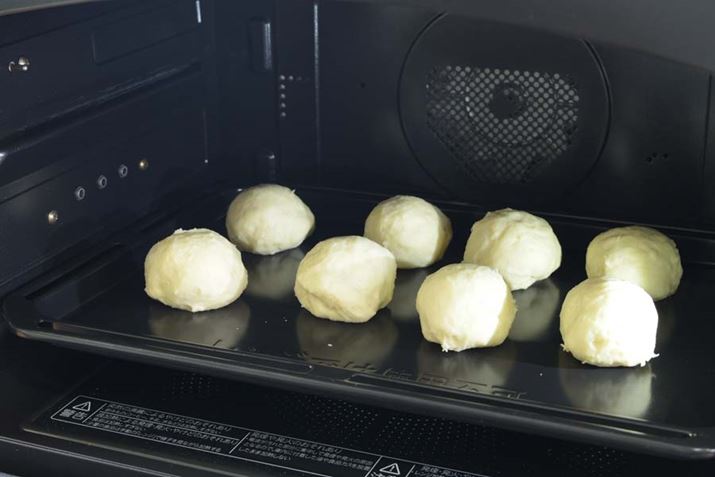 ブザーが鳴ったらボウルを取り出し、8等分して丸く形を整え、閉じ目を下にして角皿に並べて約10分休ませる。あとは角皿を下段に入れてスタートボタンを押せば、約32分かけて成形発酵から焼きまでが自動で行われ、あっという間に丸パンの完成だ
