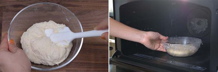 想像以上に簡単なので、「お手軽フランスパン」にも挑戦してみることに。強力粉、薄力粉、塩、ぬるま湯で溶かした砂糖、ドライイーストをゴムべらで混ぜ合わせて、生地を平らにならしたら、レンジ加熱で1次発酵。基本的な手順は丸パンと同様だ