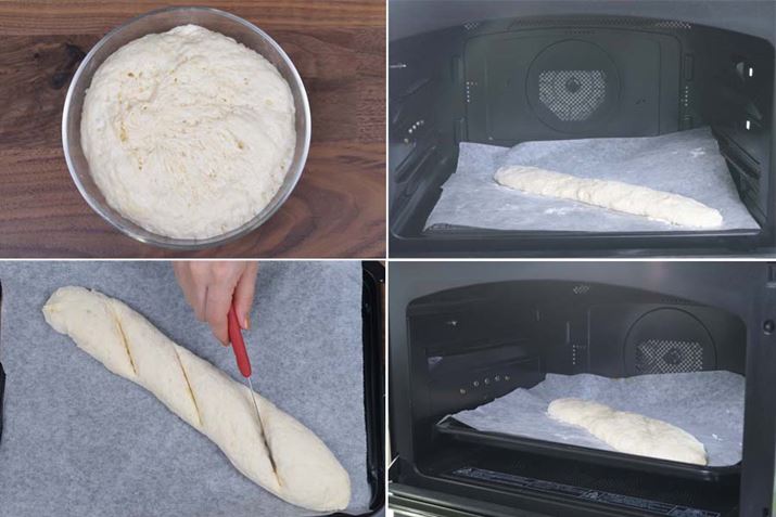ブザーが鳴ったらボウルを取り出し、強力粉をふった台に生地を取り出して楕円形に丸め、クッキングシートの上で約35cmの葉巻状に。生地をクッキングシートごと庫内中央に置いて成形発酵を開始し、途中ブザーが成ったら角皿に移し替え、予熱をしている間に包丁で生地に切り込みを入れる。予熱が終わったら、角皿を下段に入れて焼成をスタート