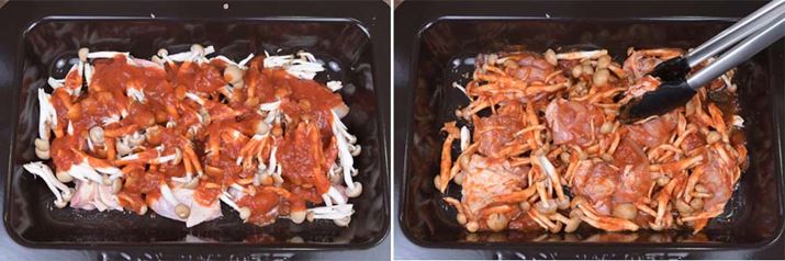 「スピード深皿メニュー」のひとつ、「鶏肉のトマトソース焼き」を作ってみよう。鶏肉を切って、全体に塩・こしょうをしたら、トマトソース、しめじ、コンソメを入れて混ぜ合わせる。これだけで早くも準備完了となり、あとは焼くだけ