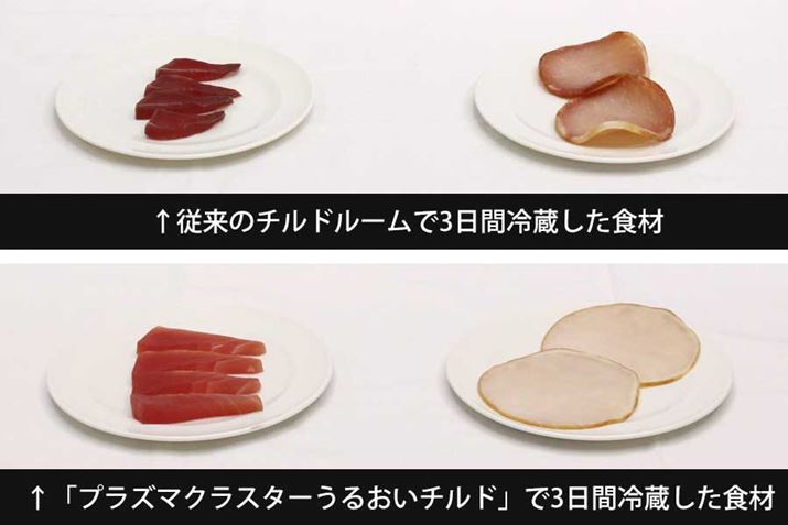チルドルームには、風を発生させずにプラズマクラスターを放出できる専用のプラズマクラスターデバイスを搭載しているため、加工肉やお刺身など生ものの乾燥を抑えながら、同時に清潔さを保てます(食材の比較写真は2017年モデル発表時のもの)
