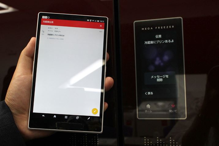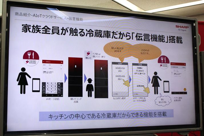 また、忙しいお母さんにうれしい機能として、冷蔵庫の液晶ディスプレイを使った伝言機能も搭載されました。外出先からスマートフォンの「COCORO KITCHEN」アプリを使い、家族あてのメッセージを入力して冷蔵庫に送信すると、その内容が冷蔵庫側の液晶ディスプレイに表示されます。