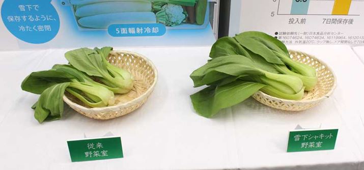 野菜室が冷凍室に囲まれる配置とすることで、雪の下に埋もれた野菜の状態を再現し、野菜をシャキッと保存できる「雪下シャキット野菜室」も(チンゲンサイの比較写真は2017年モデル発表時のもの)