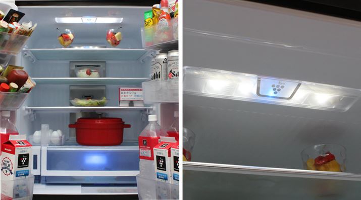 電動フレンチドアを開けると、本体上部とチルドルームの2か所にブルーライトが配置されるデザインになりました。“プラズマクラスター出てる感”が視覚的に伝わってきます