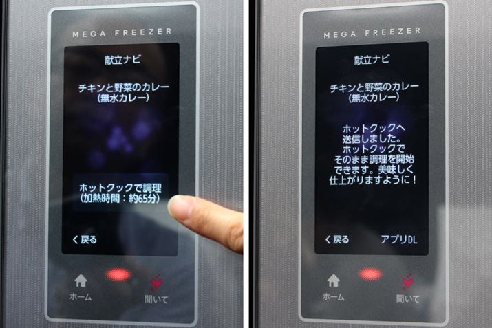 そして2018年モデルでは、冷蔵庫がおすすめしてくれたレシピ情報を、同じく「COCORO KITCHEN」に対応するウォーターオーブン「ヘルシオ」や自動調理鍋「ヘルシオ ホットクック」に送信できるようになりました。冷蔵庫の液晶ディスプレイからレシピを選び、そのままヘルシオやヘルシオ ホットクックで調理できるのです。
