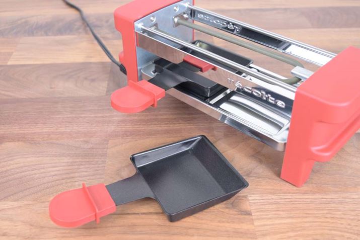 ラクレット調理の際は付属のミニパンにチーズを入れて、下段にセットする。ミニパンは、チーズが滑りやすく焦げつきにくいよう、ノンスティック加工が施されており、お手入れもしやすい