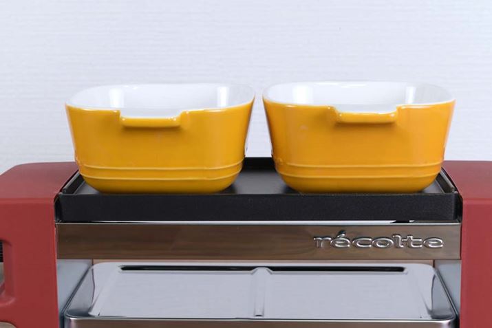 チーズフォンデュを楽しむ際は、上段にプレートのフラット面をセットし、付属のココットを乗せてチーズを温める。ココットは陶磁器製で、耐熱温度差は300℃。容量は約250mlと深さがあるので、意外と量が入る