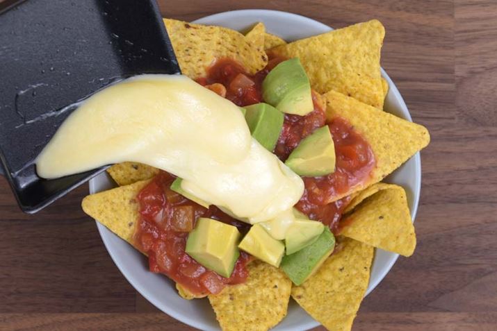 ナチョスにもチャレンジしてみることに。チップスやアボカドを盛ったお皿にチリソースをかけて、そこにとろ〜りチーズをON。熱々チーズとピリ辛チリソースの相性が抜群で、これはビールが進みそう