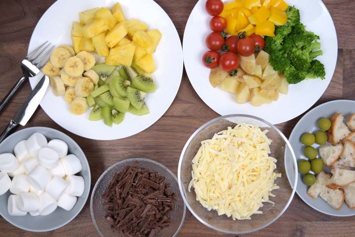 用意した食材は、チーズフォンデュ用として、トマト、ブロッコリー、パプリカ、ジャガイモ、フランスパン、オリーブ。チョコレートフォンデュ用として、マシュマロ、バナナ、パイナップル、キウイフルーツ。チーズにはピザチーズを、チョコレートには板チョコを使用した