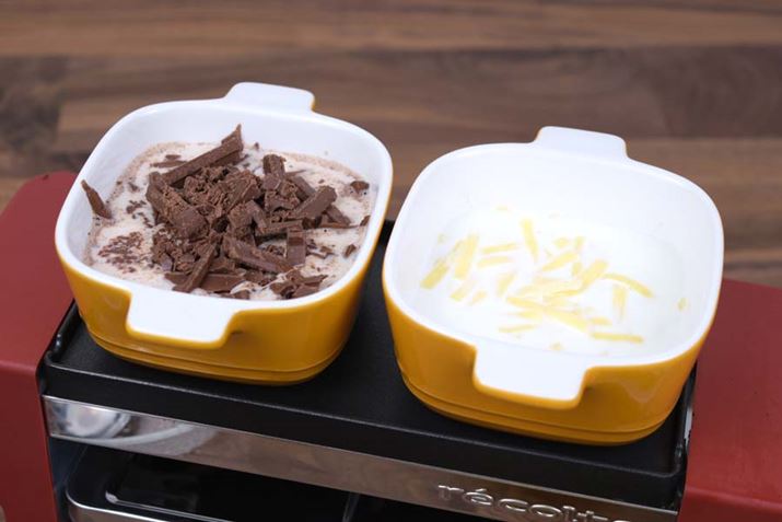 チーズフォンデュ用のココットには、チーズ、ニンニク、白ワインを、チョコレートフォンデュ用のココットには、チョコレート、ミルクを入れ、それぞれプレートにのせる。ココットを温める際は、予熱の必要はない