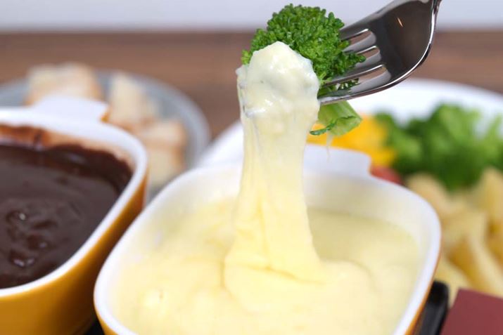 フォンデュソースが溶けたところで、早速ブロッコリーをチーズにドボン。ほどよく温まったチーズとブロッコリーがからみ合い、これまた「絶品」のひと言だ