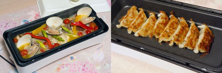 平面プレートとフタを使ってアクアパッツァ(左)や餃子(右)を作ってみました。3,000円後半の価格にも関わらず、たこ焼きに加えて、さまざまな料理に対応しているのはうれしいですね