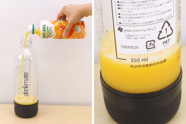 ボトルの中にオレンジジュースを入れて作ってみました。水以外の飲料は、最大「350ml」の線まで入れることができます。なお、粘度のある液体や、果肉がたくさん入っているタイプのジュースなどは、ノズルの詰まりの原因になるため使用NG