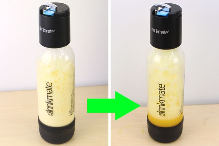 ジュースのように糖分の入っている飲料は、ガス抜き中にものすごく泡立ちます。少し面倒なのですが、インフューザー上部のタブを開けたり閉じたりを繰り返して、徐々に泡を少なくしていきながらガス抜きしましょう(ずっとタブを開けっ放しにしておくと、泡立ちすぎて中身があふれてしまうので注意)