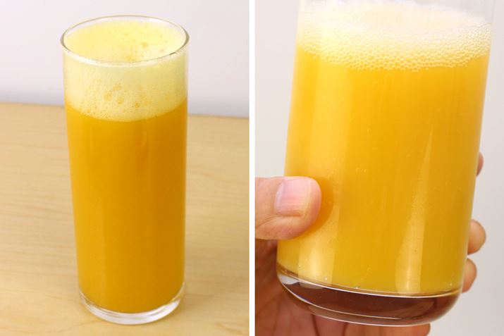 できあがった炭酸オレンジジュースはとにかくおいしかった! やはり、味が薄まらないのがイイです。炭酸直接注入、サイコー。100%オレンジジュースで作ると、オレンジの酸味や糖分の甘さもしっかり残っています