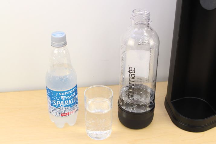 大好きな「サントリー 南アルプススパークリング」と飲み比べ! あくまでも筆者が試した感じですが、ドリンクメイトで水に炭酸を5〜6回注入すると同等レベルになるようでした。ちなみに、7回以上炭酸を注入してみたら、だんだん炭酸の刺激が強すぎて辛くなってきました