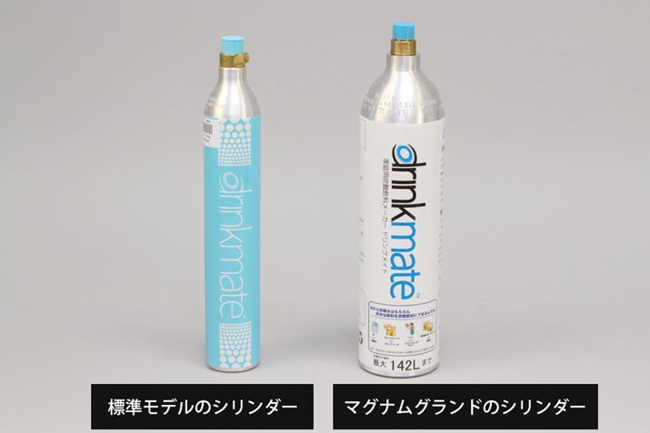 ドリンクメイト標準モデルのガスシリンダーは容量410gですが、新しいマグナムグランドのガスシリンダーはなんと975g! 2倍以上の容量があり、最大で142l分の炭酸水を作れるとされています。これだけあったら、思う存分シュワシュワできますね。ドリンクメイト、猛暑と強炭酸ブームに全力コミットしてきている印象です。